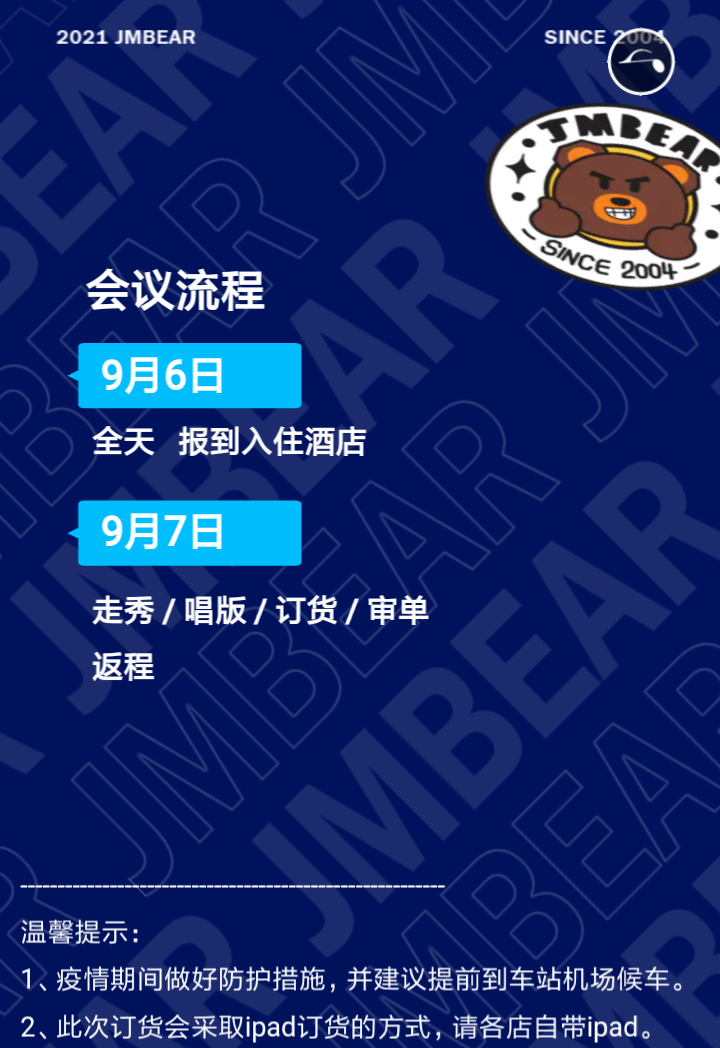 您好!“杰米熊”2021春夏季新品发布会暨订货会将于2020年9月7日在河南郑州举办,诚挚邀请您前来参加,本次发布会除了给您带来新一季的春夏时尚发布秀活动,欢迎您前来订货或洽谈合作事宜。