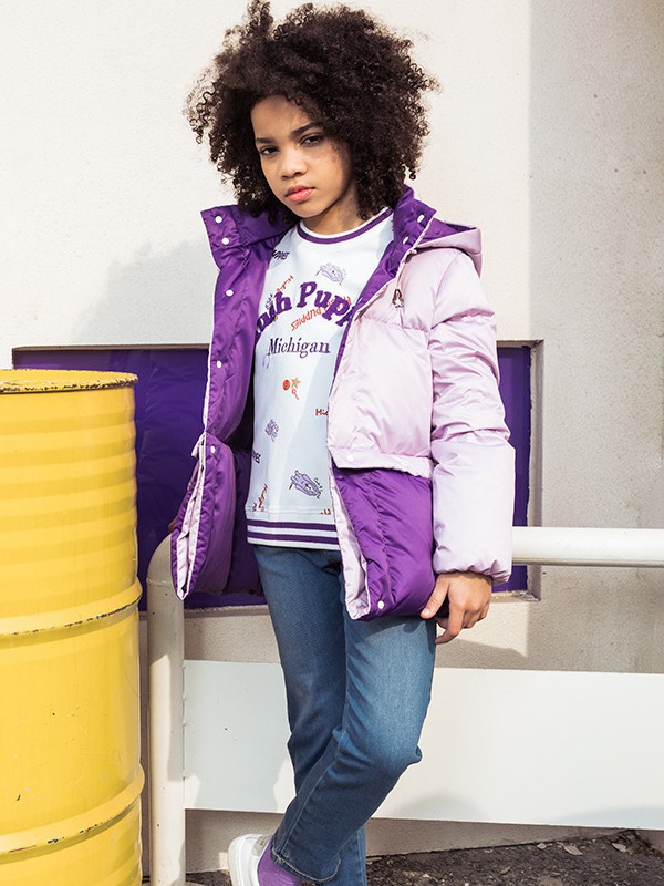 入冬了之后,气温下降,女宝宝可以为自己选择一件紫色的连帽羽绒服,颜色出挑提升造型的亮度,穿起来保暖有设计感,提升造型的时尚感。里面搭配一件浅色系的卫衣,避免沉闷感,增添了英文图案让造型更为时髦。下身搭配一条简约风牛仔裤,穿起来率性时尚,呈现出了保暖不失时尚感的女童穿搭!