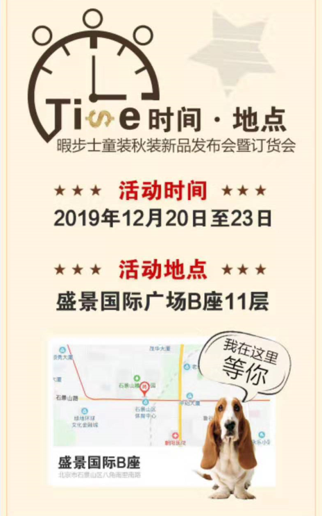 2019年12月20日-12月23日,Hush Puppies暇步士童装2020秋季新品发布会暨订货会将在北京市盛景国际大厦B座11层精彩启幕!我们诚邀您与我们精彩邂逅,一起共赴2020年秋装童装时尚盛宴。倒计时正式响起,还有3天,一场时装盛宴将拉开帷幕,敬请期待!