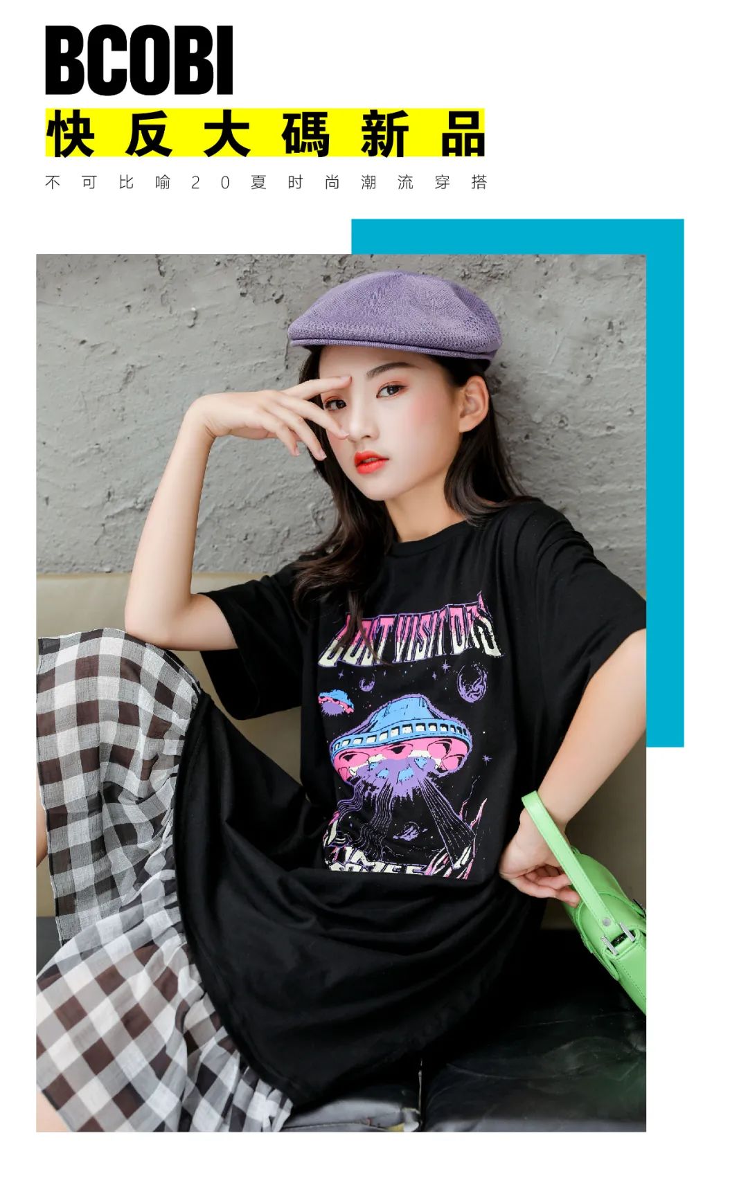 舒适棉质长裙,拼撞雪纺格子下摆,科幻加英文字母印花图案的结合,宽松的版型穿着舒适,时尚且大方。