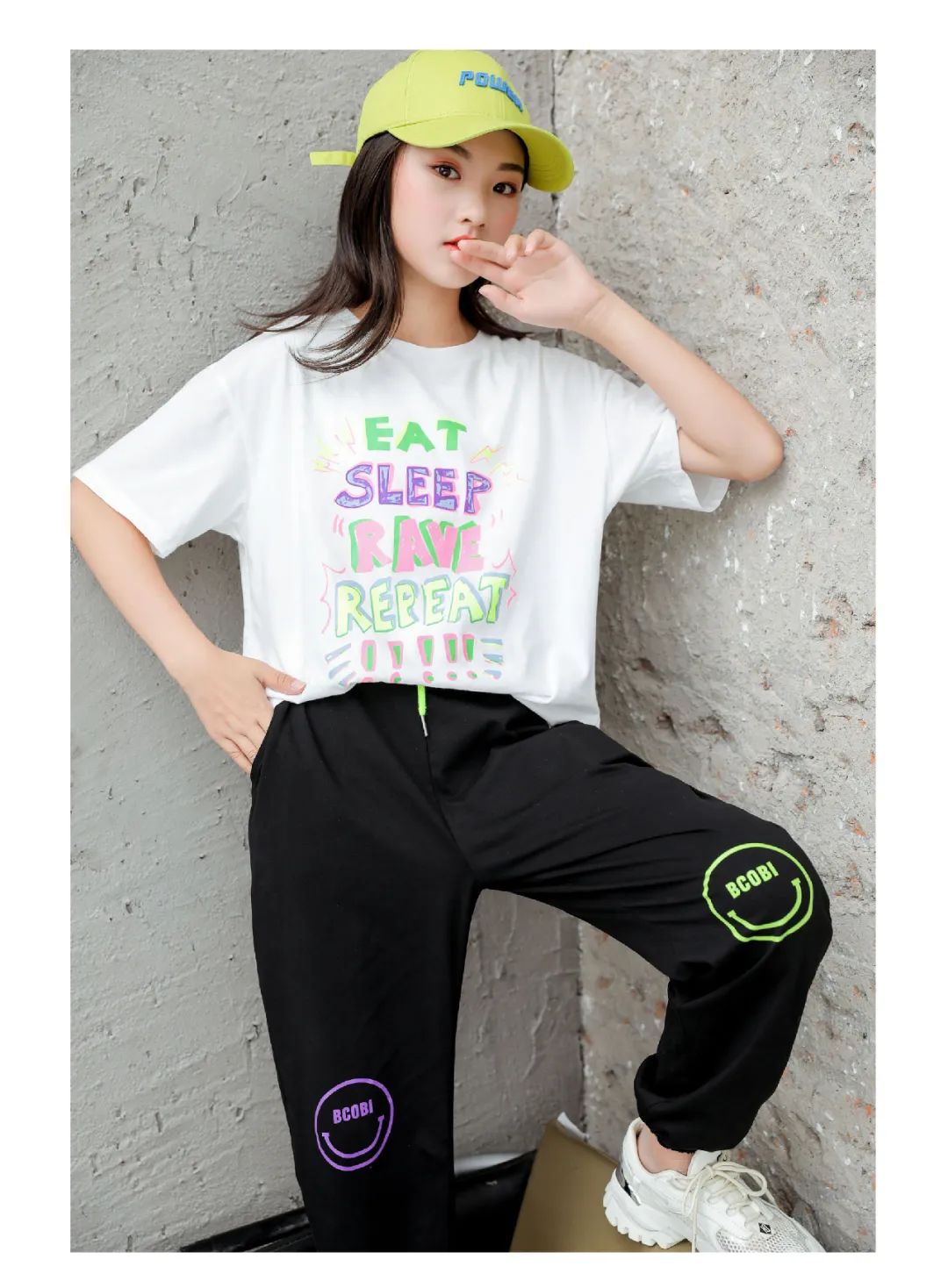 小圆领T恤,轻薄舒适,色彩丰富的印花图案,时尚简约。纯棉九分裤,不对称颜色印花加撞色的腰绳,休闲百搭。