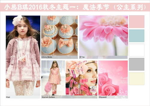 魔法季节含柔和的粉彩色有粉红色、粉蓝色为主,白色为辅色打造甜美,灰色和杏色做为点缀,奠定了调色盘的魔法基调,正因为这些色彩,以蝴蝶结、荷叶边、蕾丝,甜美的图案元素细节来营造系列的氛围。