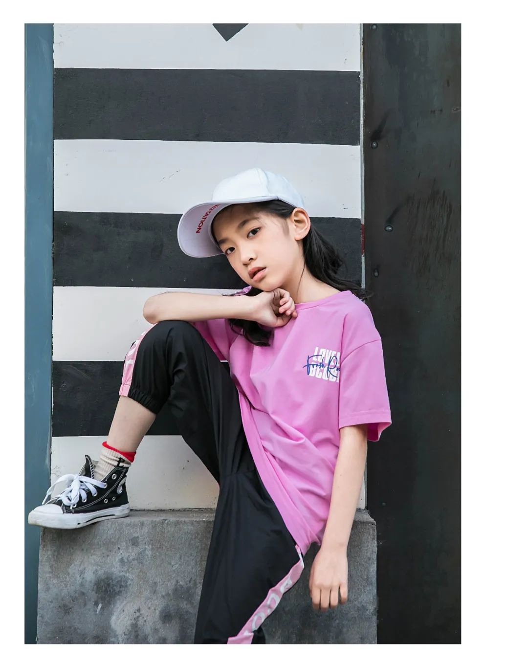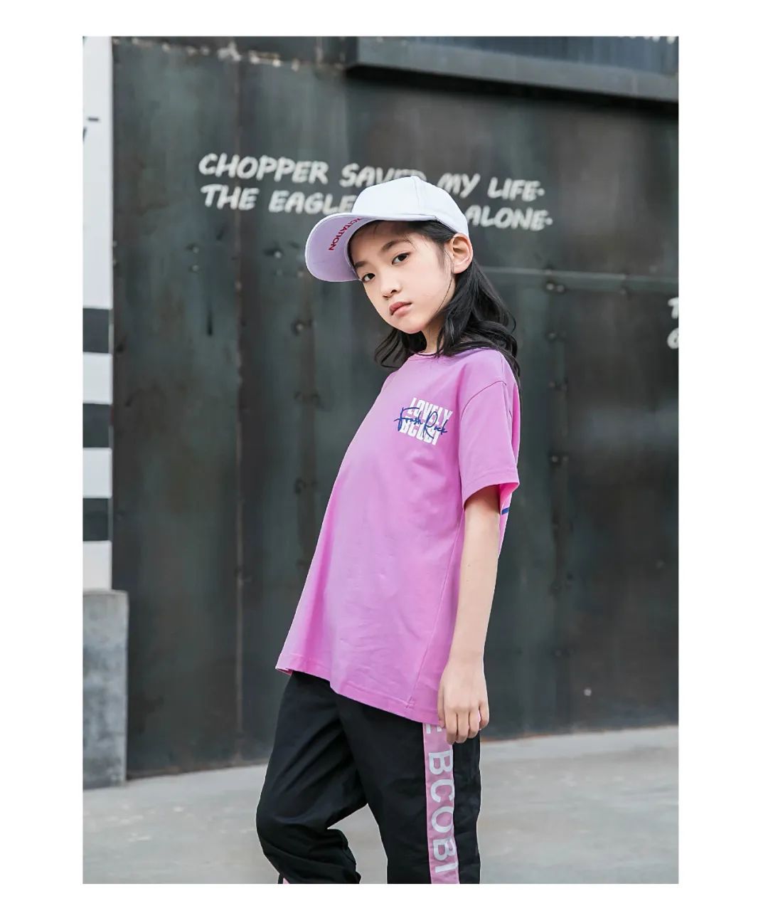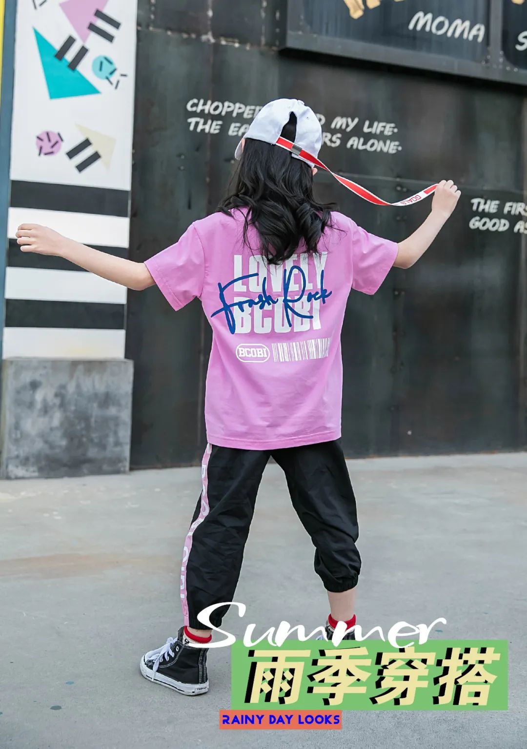 山茶花粉T恤,左前胸印花简约时尚;搭配宽松休闲长裤,侧缝印花织带增添了细节,搭配性强。