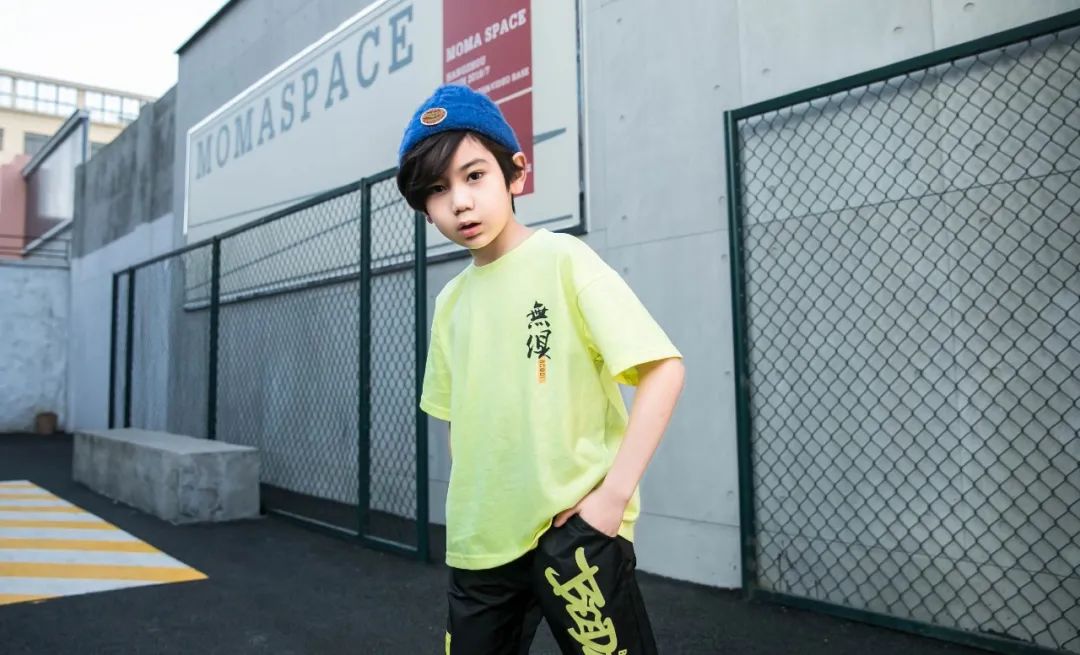 亮色T恤,前胸图案点缀,时尚大气;休闲中裤,荧光绿的印花和标的加入,使整条裤子青春有活力。