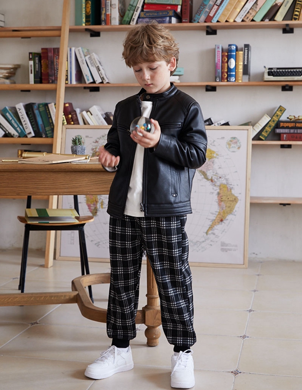 上身黑色亮面皮质夹克,下身百搭格子缩脚裤,喜欢酷盖耍帅的宝宝一定不要错过,这样一套内搭不管是搭配白色还是黑色,都能够让你成功成为接头又拽又帅的男生女生!