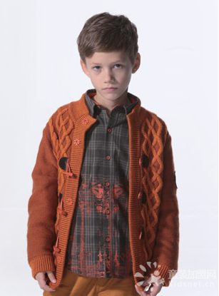 妈妈对于一个男孩的偏爱,可能就会把男孩当成女孩子来养育。男孩在开衫的穿着上难免走上柔弱的气质,流于一种不够男孩子气的世俗,经典螺纹也不足以展现气势,牛角扣时尚。橙色中带着深棕色,跳跃之中尽显沉稳。