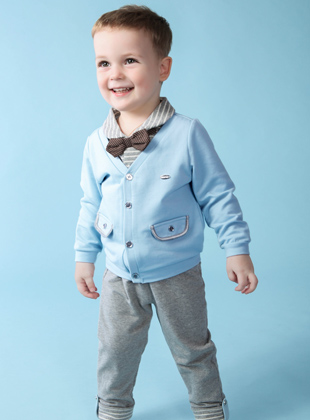 当当当当~接下去推荐的这一套萌娃装深得小编喜欢,浅蓝棉质V领外套内搭一件儿童衬衫领搭蝴蝶结领带,简直萌得不要不要的,虽然搭配的是小可爱蝴蝶结领带,但是舒适的棉质感丝毫不影响灰色休闲裤的搭配,裤腿还别出心裁的做可拉伸处理,在不影响美观的同时适应了我们小盟主在长身体发育阶段,延长了裤子的使用寿命,妈咪再也不用担心啦!