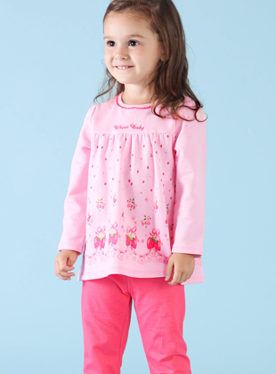 首先映入眼帘的小女娃身着粉色棉质上衣,衣身胸围以下做裙摆褶皱处理,以下部分做星星点点的印花,衣服最下部做可爱的蝴蝶结收边处理,显得小女娃俏皮可爱,搭配深粉色的休闲裤,显得我最粉嫩啦,蜜汁萌萌哒小公举就完成了。